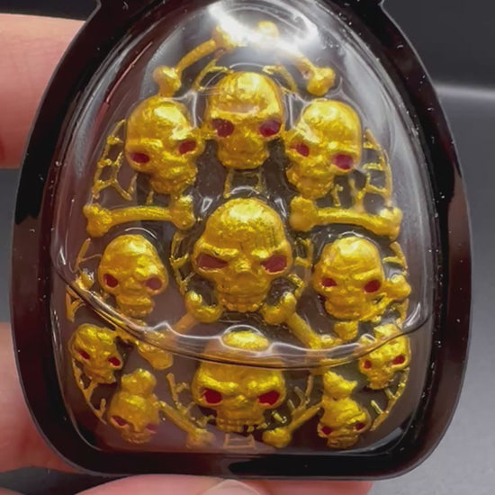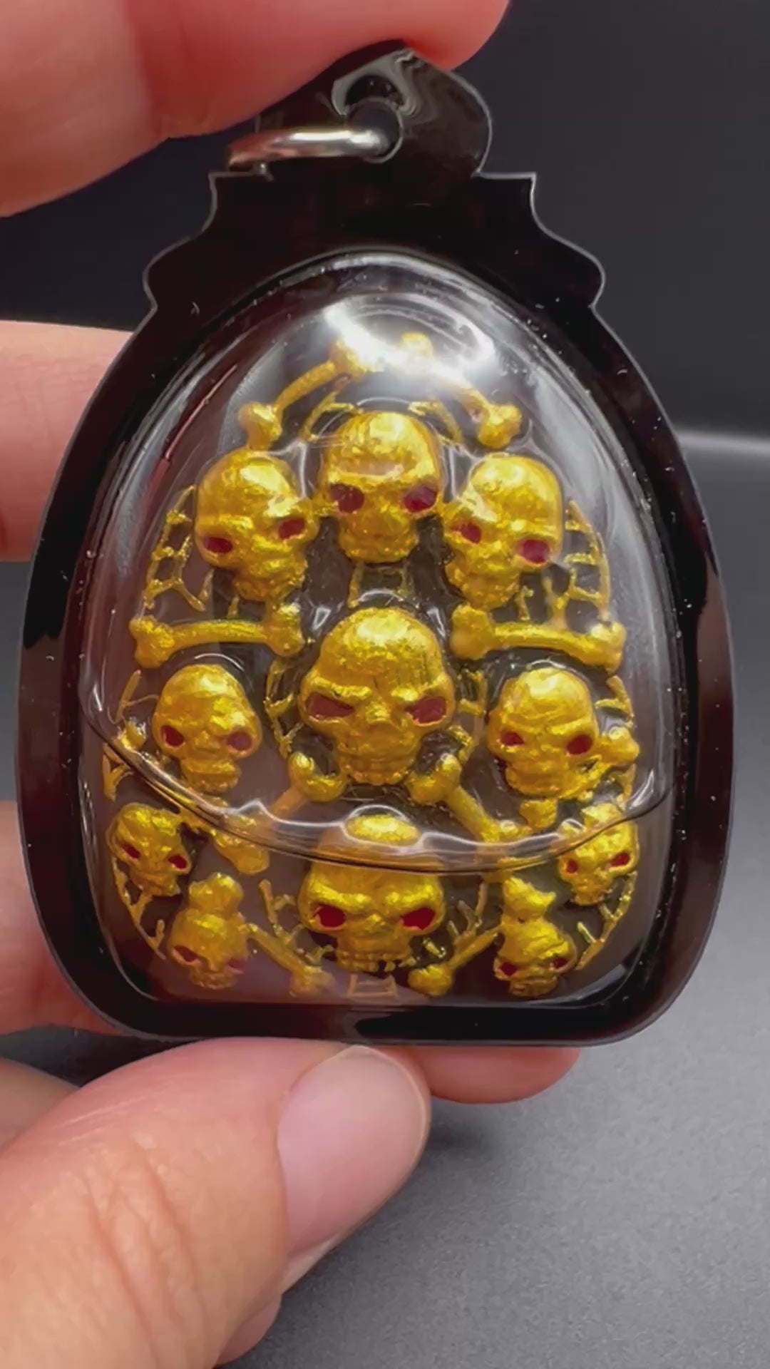 Per questo motivo, gli amuleti di Prai Tong sono spesso rappresentati seduti sopra numerosi teschi, simbolo degli spiriti che egli comanda!