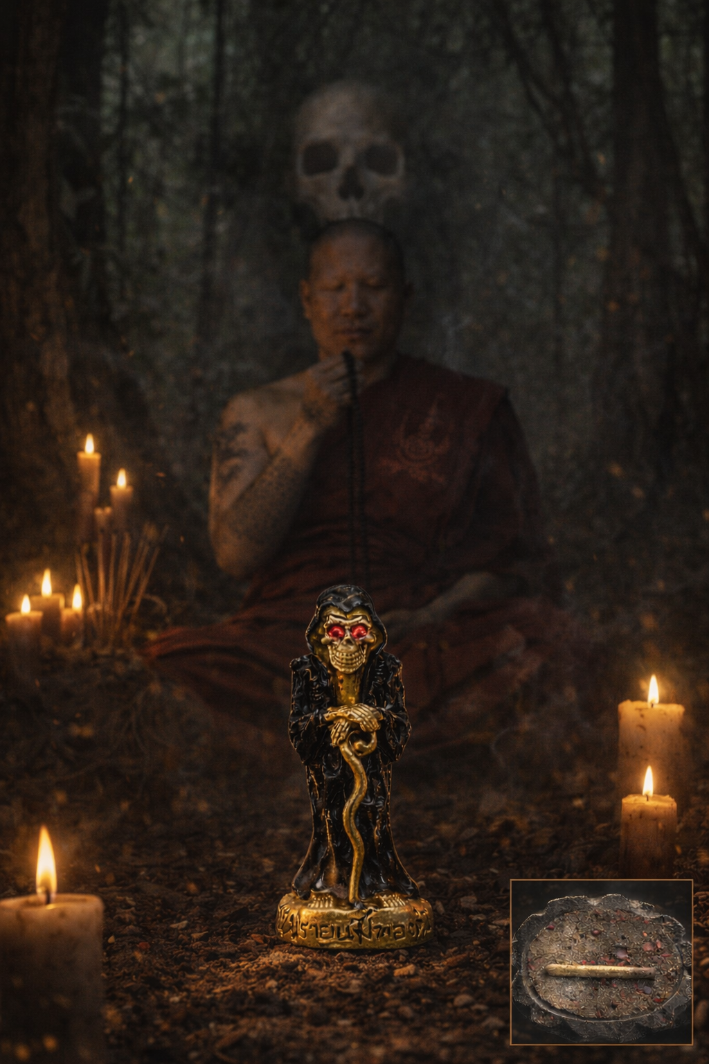 Essa è una figura spirituale della corrente esoterica Lanna del Nord della Thailandia, associata alla saggezza dell’impermanenza, alla protezione sottile e all’aiuto concreto verso chi chiede sostegno. La sua leggenda entra nella linea rituale di Aj Subim, che — secondo la trasmissione — ne riconobbe la presenza durante le sue meditazioni da giovane monaco, dopo aver ricevuto dal suo maestro, un antico teschio femminile consacrato.