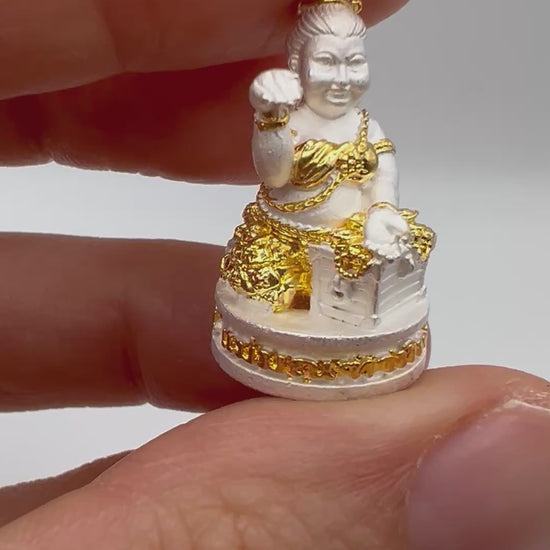È rappresentata come una donna bella in abito tradizionale thailandese, con la mano destra alzata in un gesto di richiamo (simile al celebre gatto Maneki Neko giapponese) e spesso con un sacchetto d’oro nella mano sinistra.