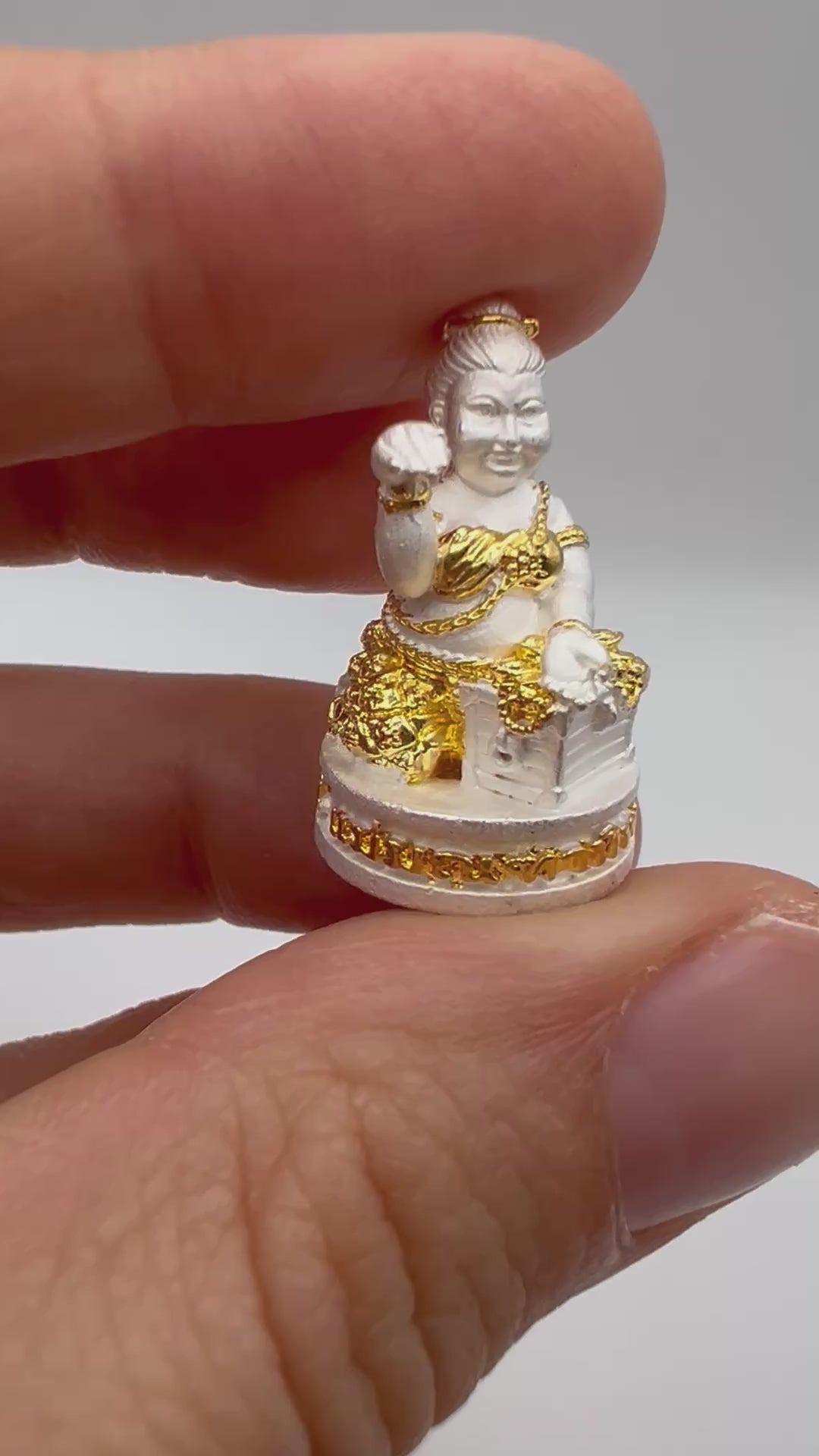 Questo potente amuleto Nang Kwak Maha setthi, forgiato in metallo sacro rivestito in argento, è stato creato con l’intento di attrarre fortuna, prosperità economica e successo negli affari.
