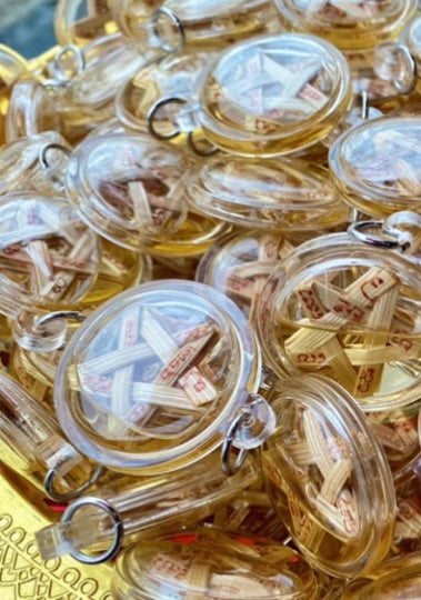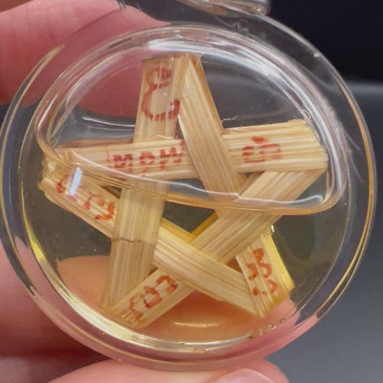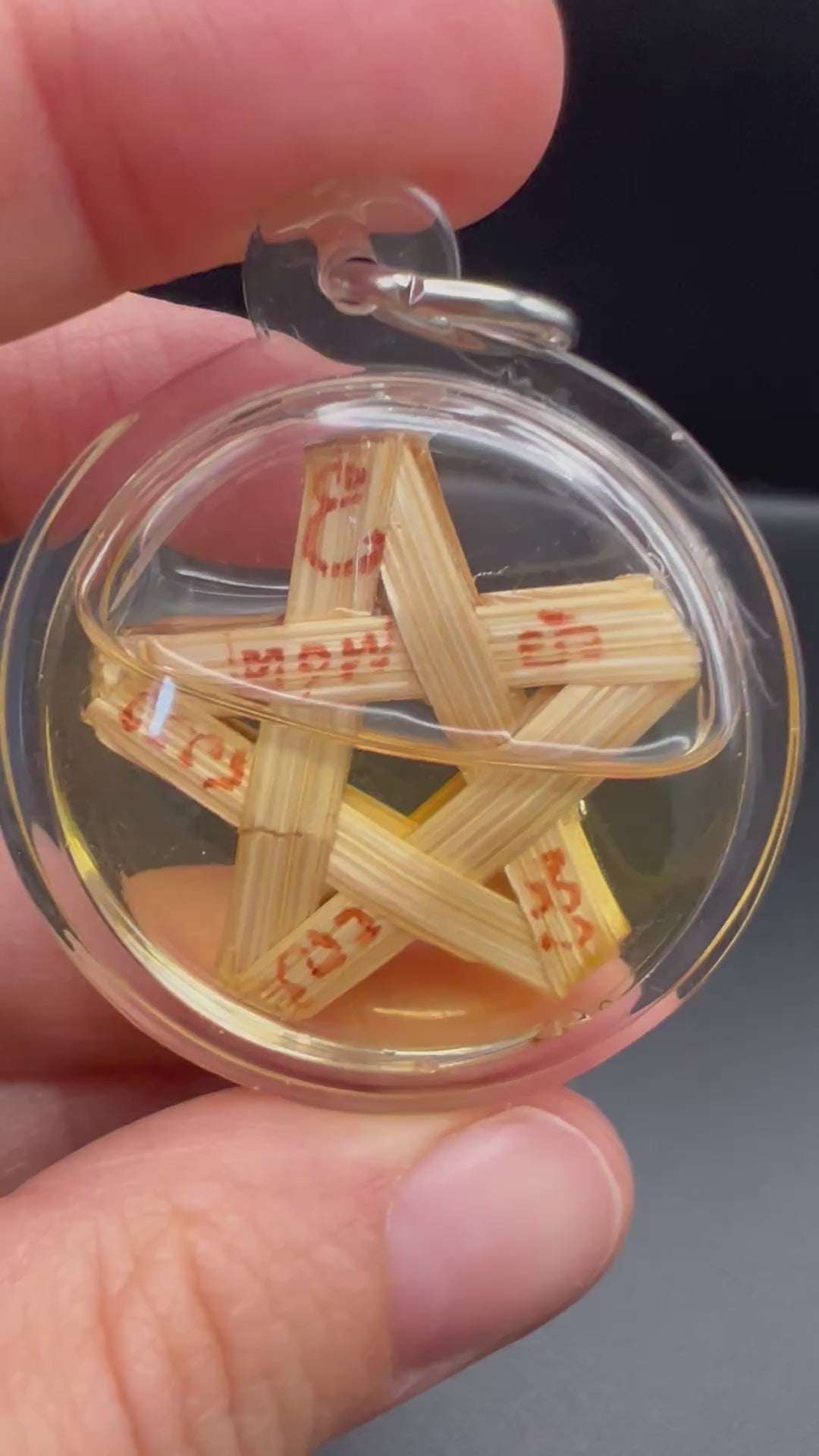 Intrecciato a mano con pregiate strisce di bambù, il Chaleo incorpora sigilli magici carichi di significato spirituale ( Rune sacre Lanna E, Hi, Kha, Le, So) e racchiuso in una cornice protettiva trasparente, infusa con olio Chatri, olio Sangkhalok e olio santo benedetto, secondo antichi rituali monastici.