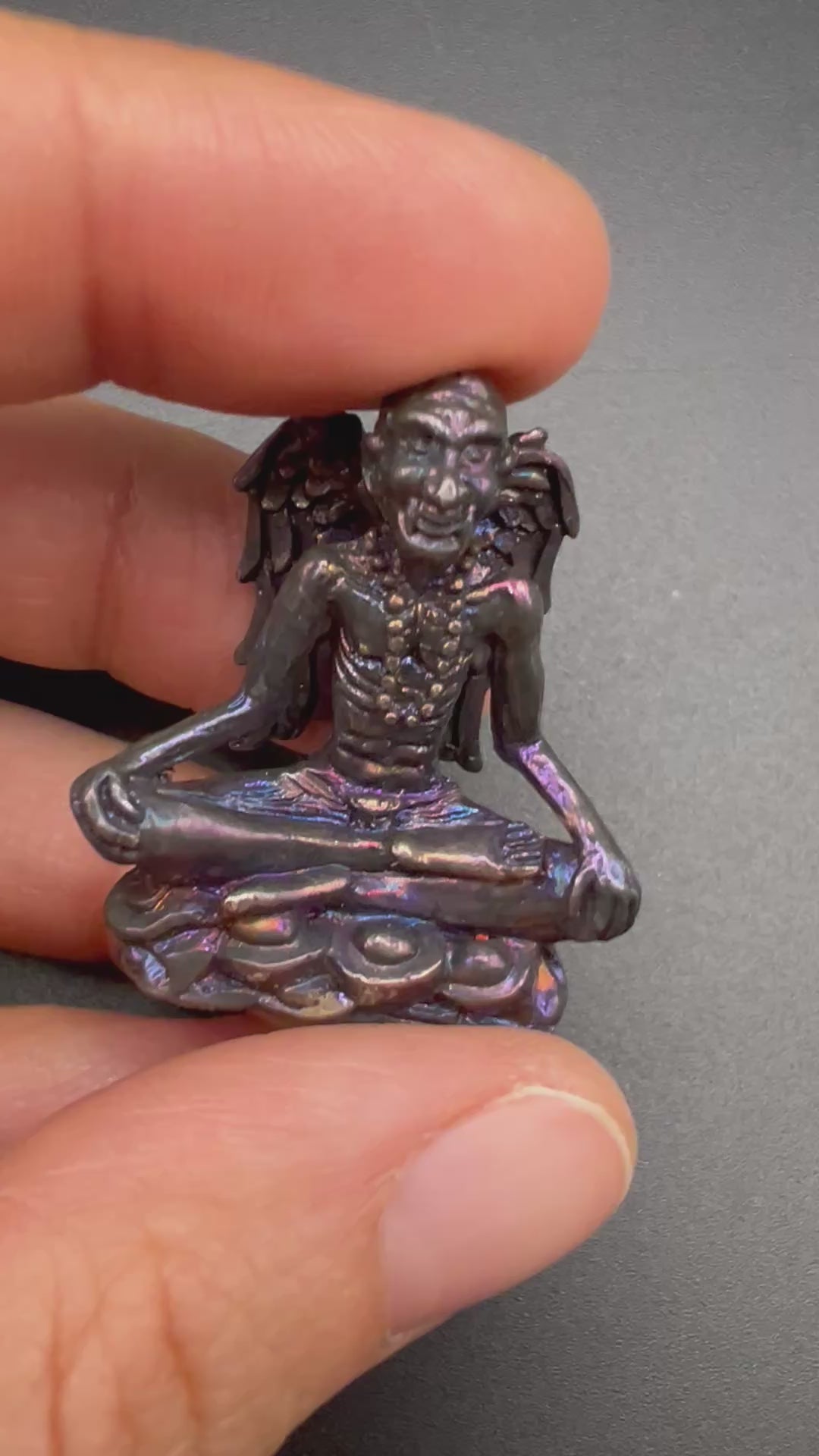 Realizzato con un minerale selezionato direttamente dagli eremiti, questo amuleto è caricato energeticamente con incantesimi tradizionali e custodisce due Takrut incastonati alla base, contenenti Yant sacri – simboli mistici che ne potenziano l’efficacia.